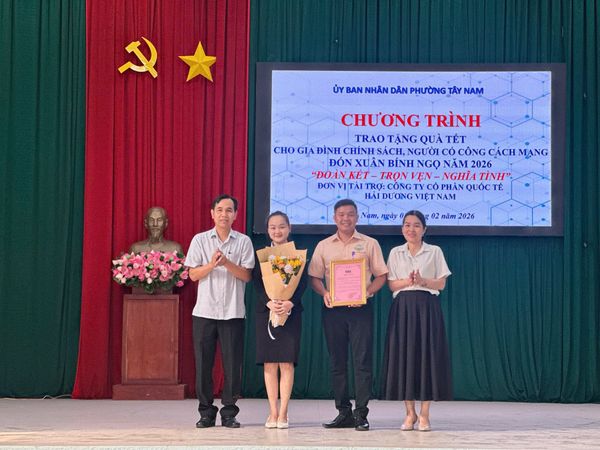 Tại buổi lễ, lãnh đạo phường Tây Nam đã trao thư cảm ơn và ghi nhận sự đồng hành, hỗ trợ thiết thực của Công ty Cổ phần Quốc tế Hải Dương trong công tác an sinh xã hội tại địa phương, đặc biệt là hoạt động chăm lo Tết cho các gia đình chính sách, người có công với cách mạng.